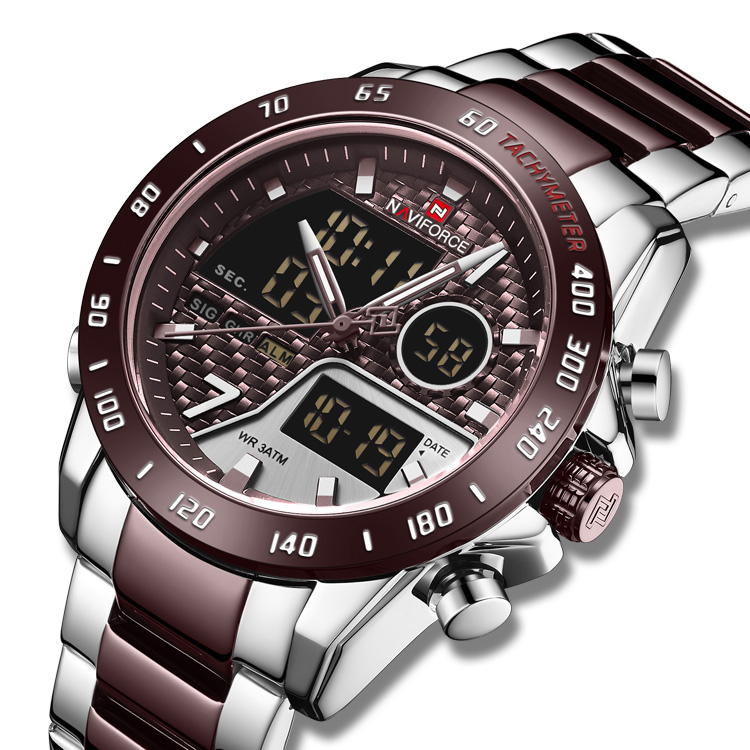 و شیشه معدنی ، فول تایم،نمایش تاریخ،نمایش روزهای هفته،نمایش 24 ساعته زمان،شیشه معدنی ضد خش،عقربه های شب نما،رنگ ثابتکیس،ضد آب،بند چرم طبیعی،لوگو حک شده Naviforce رو و